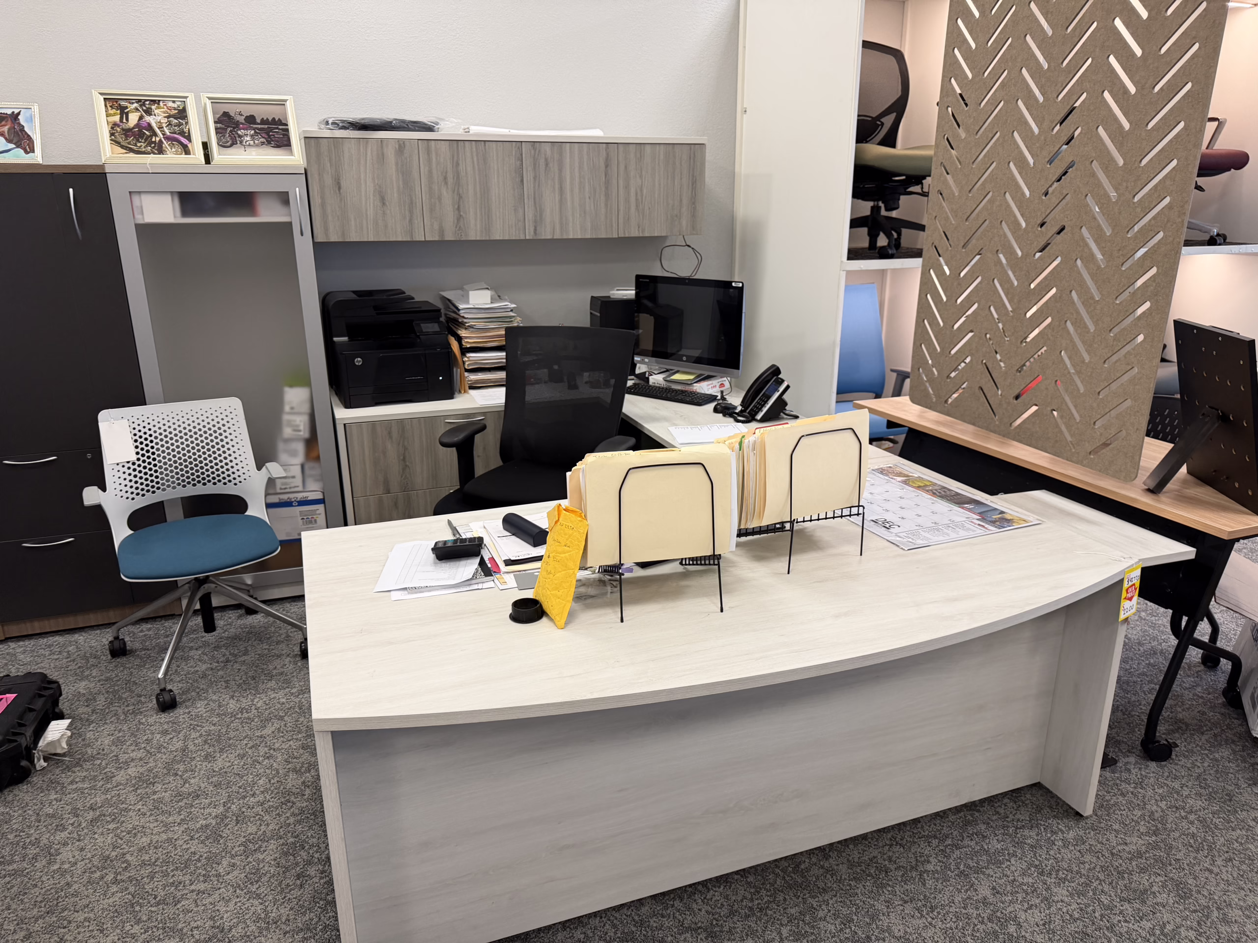 - Modern – 72″w x 42/36″d x 29″h – Desk Shell – Bow Front – Free Standing – Whole Whole – Full Back Panel